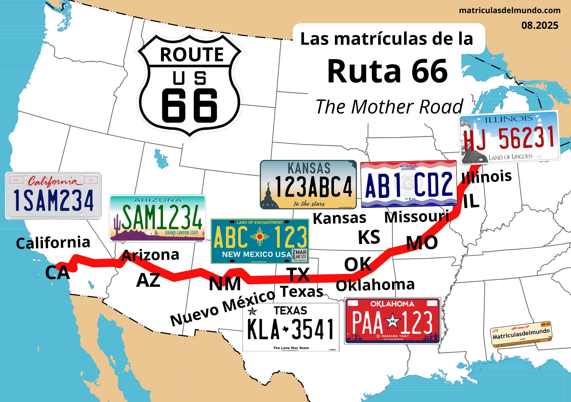 En este recorrido se pueden ver matrículas de los estados que la ruta atraviesa: California, Arizona, Nuevo México, Texas, Oklahoma, Kansas, Misuri e Illinois. En particular, en Oklahoma se encuentran muchas matrículas curiosas emitidas por distintas tribus nativas americanas, que añaden aún más variedad y colorido a la carretera. Estas matrículas siempre incluyen el nombre del estado “Oklahoma” junto a la identidad tribal, lo que las convierte en un detalle fascinante para cualquier viajero que recorra la Ruta 66.