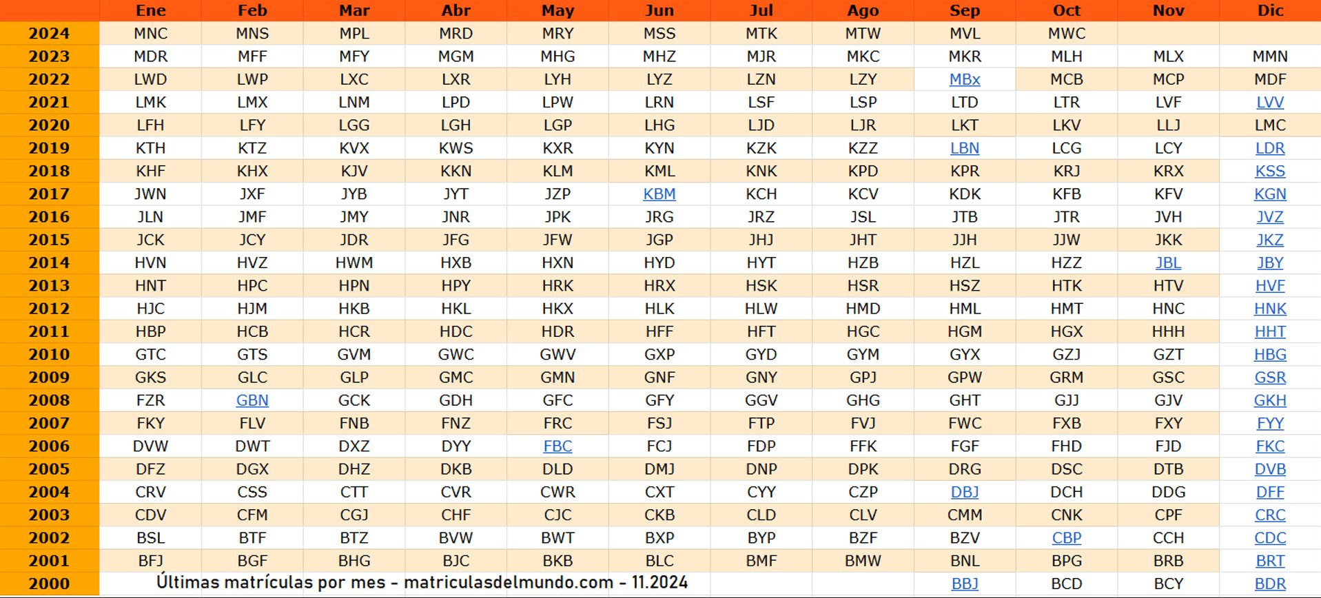 En la tabla puedes consultar las letras de las últimas matrículas asignadas cada mes a los coches desde septiembre del 2000 en el sistema de matrículas actual.