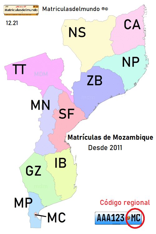 Las matrículas de Mozambique desde 2011, utilizan una placa vehicular en tonos azul y blanco con caracteres negros. La matrícula de Mozambique tiene una configuración de tres letras y tres números en serie, el escudo estatal, y un código regional de dos letras.