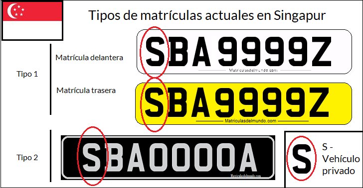 Las matrículas de coches de Singapur actuales utilizan un diseño estándar europeo basado en el británico. La configuración de las matrículas de Singapur es de tres letras, comenzando por la letra S. A continuación se muestran cuatro números y una letra. El fondo puede ser negro o amarillo/blanco.