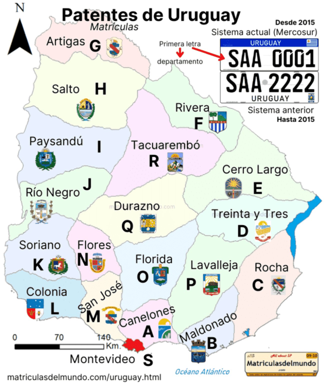 Las matrículas de coches de Uruguay (patentes de auto de Uruguay) desde 2015, utilizan el tamaño y formato estándar del Mercosur. La configuración de las matrículas de coche de Uruguay es de tres letras y cuatro números. La primera de las letras de la matrícula identifica a la región. En la parte superior se muestra el nombre de Uruguay y la bandera nacional en la parte superior derecha.