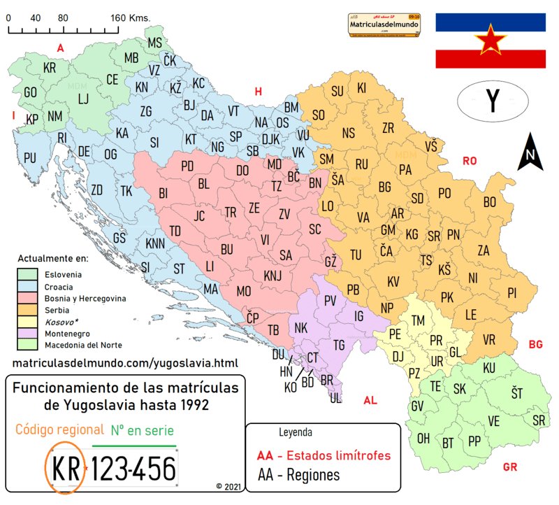 Cuando los países que formaban parte de Yugoslavia se dividieron, las matrículas que se utilizaban dejaron de ser válidas y fue necesario rematricular toda la flota de vehículos para obtener las nuevas matrículas. Cada país tuvo su independencia en una fecha diferente, así que las matrículas fueron válidas hasta diferentes años en función de la zona. Puedes tener más información visitando el apartado de cada uno de los países Bosnia, Croacia, Eslovenia, Macedonia del Norte, Montenegro, Serbia y Kosovo*.