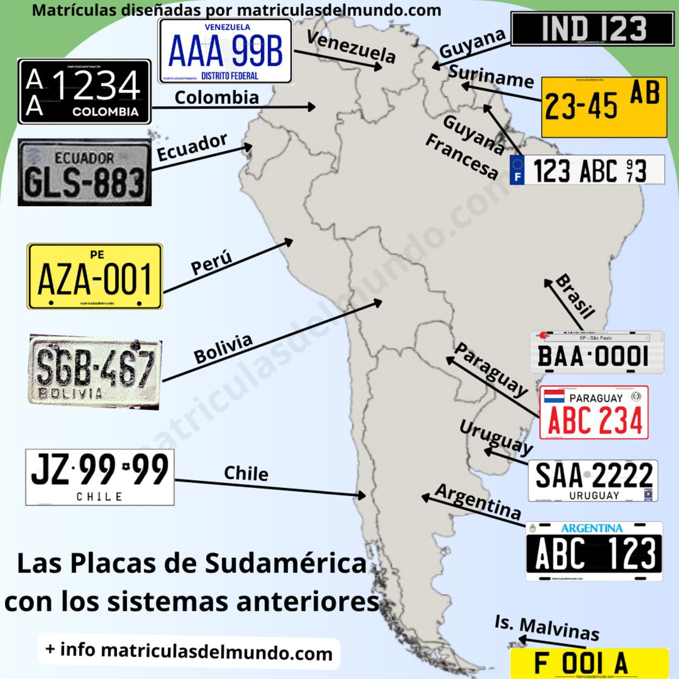 Las matrículas de coches en Sudamérica son similares a las utilizadas en América del Norte. A continuación explicamos en detalle los funcionamientos país a país y con un ejemplo de cada uno, y también de las matrículas utilizadas en los diferentes territorios del continente.