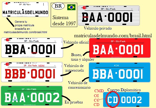 Las matrículas de coches de Brasil desde 2018, utilizan el soporte y el formato de las matrículas del Mercosur. En la parte superior se muestra una franja azul en la que se muestra BRASIL y la bandera nacional. La configuración es de tres letras, un número, una letra y dos números sin códigos regionales en la numeración.