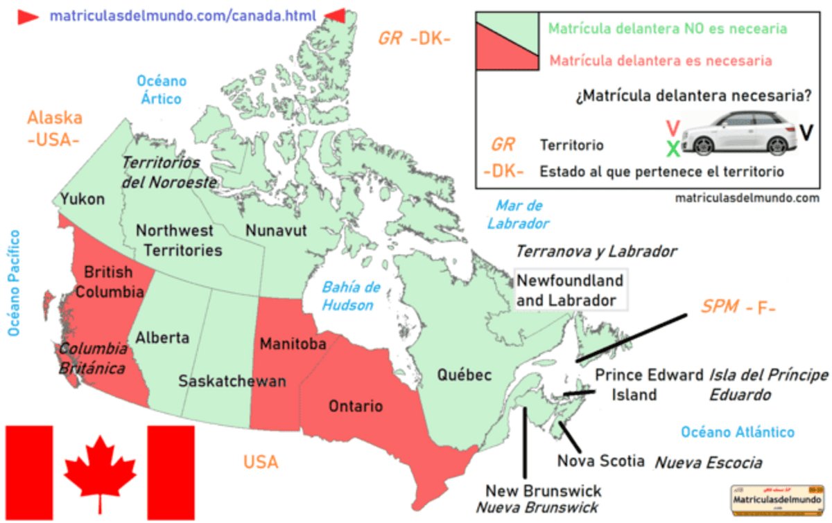 Las matrículas de coches de Canadá actuales, son emitidas por cada provincia o territorio, y no a nivel nacional. El tamaño siempre es el americano de 9x6 pulgadas o 15x30 cm. Por lo general, se muestra el nombre de la provincia o territorio en la parte superior o inferior de la placa. Suele indicarse en la propia placa de matrícula si es un vehículo especial con texto.