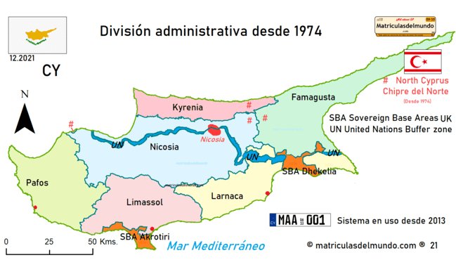 Chipre se encuentra dividida actualmente entre la zona grecochipriota y la turcochipriota. Esta separación ocurre desde 1974, fecha en la que Naciones Unidas llegó a la isla para intermediar entre ambos. Esta separación implica una separación física, consistente en una zona en la que no es posible acceder. Los vehículos oficiales del personal de Naciones Unidas, utilizan matrículas que comienzan con las letras UN (United Nations) o UNDP (Programa de las Naciones Unidas para el Desarrollo), en caracteres blancos sobre fondo azul y un número en serie.