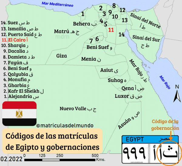 Las matrículas de coches de Egipto desde 2008, utilizan una placa de tamaño ancho similar al americano. La configuración se divide en tres líneas. En la superior, sobre fondo azul, se muestra EGYPT, tanto en inglés como en árabe. En la segunda línea se muestran tres números y tres letras en árabe. En la tercera línea, en un tamaño reducido, se muestra en caracteres latinos.