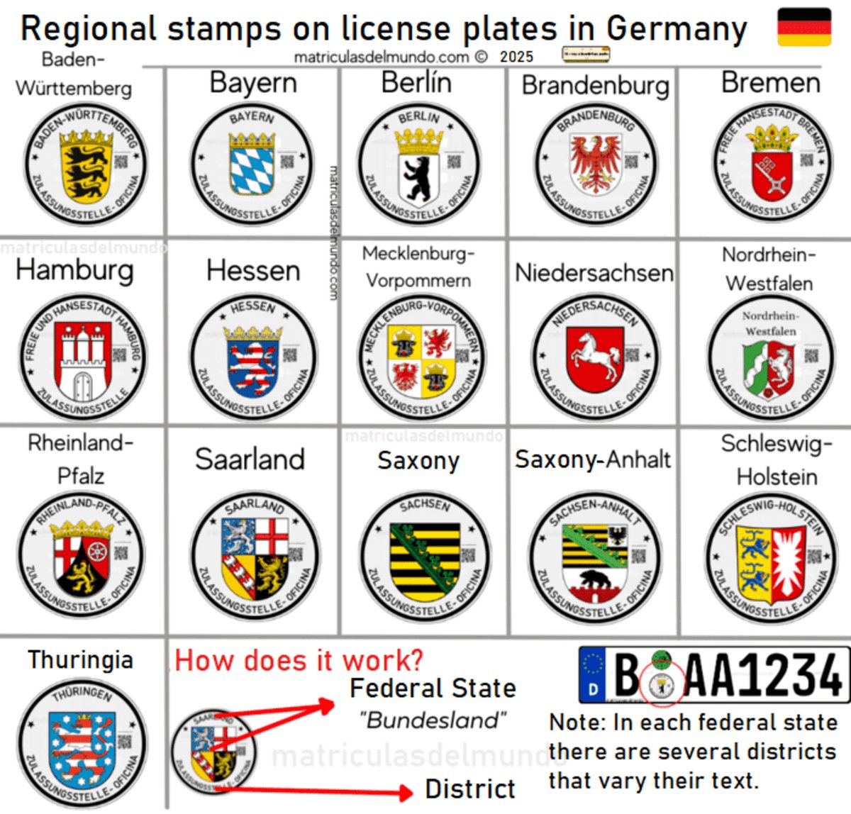 Since 1994, German car license plates have used the European format, headed by the Euroband with the letter D. The configuration consists of one, two or three letters identifying the district, followed by the MOT seal and the state seal. Next, a combination of one or two letters and one to four numbers is displayed to complete how it looks like a license plate from Germany.