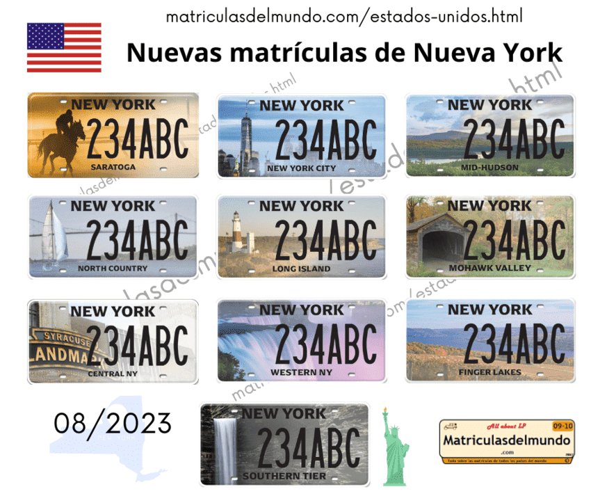 Durante el mes de junio de 2023, el estado de Nueva York fue presentando a cuentagotas 10 nuevos diseños especiales de matrículas de coche para las distintas regiones del estado. Estas matrículas son válidas solamente para vehículos privados, y tienen un coste de 60 dólares americanos. Estas matrículas no son obligatorias, pero son opcionales