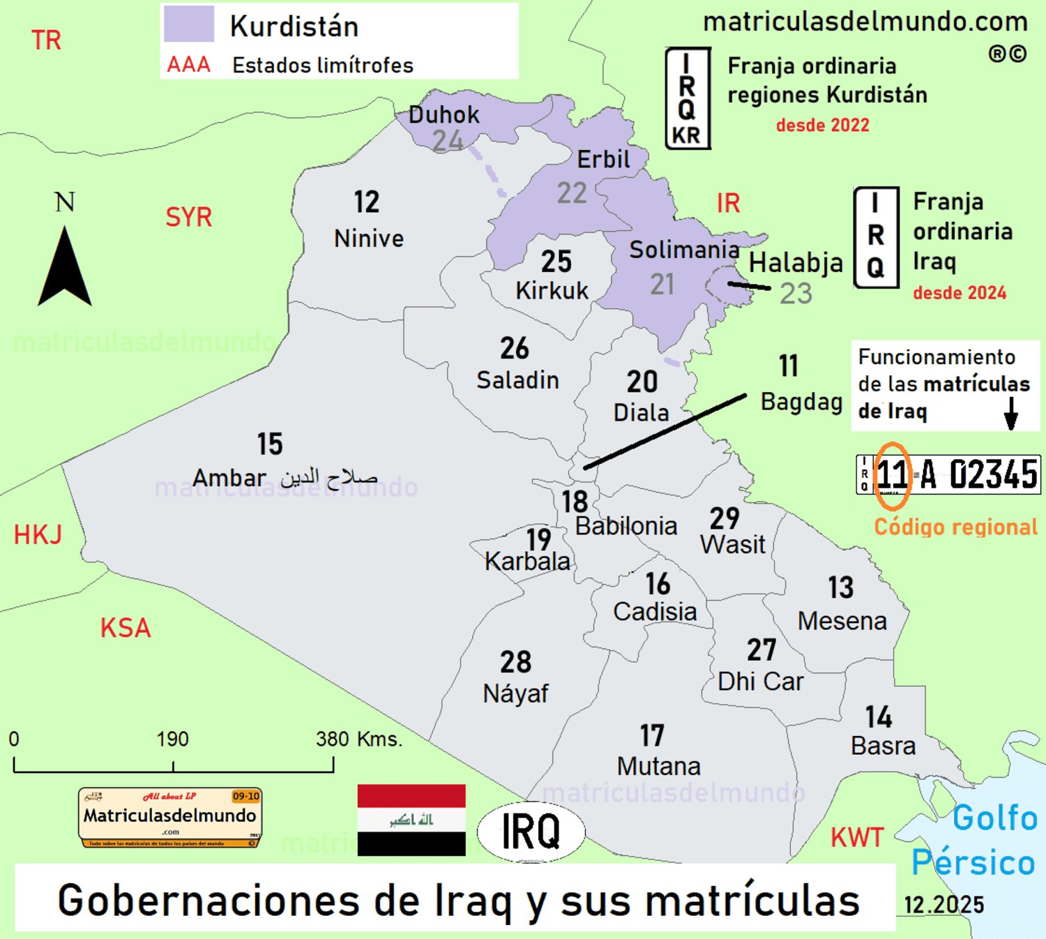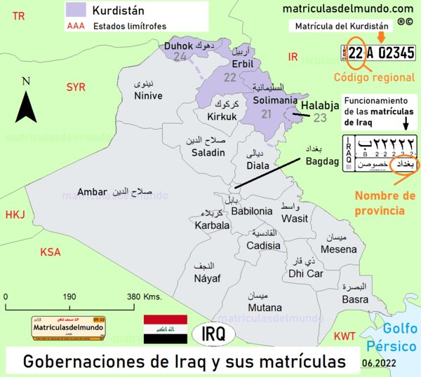 Las matrículas de coches de Iraq desde 2008, placas con un tamaño rectangular más alto que el americano. En la parte izquierda se muestra el texto IRAQ, en vertical. La configuración de las matrículas de Iraq se divide en tres líneas. La superior muestra la configuración en árabe. En la segunda línea, se muestra la configuración en caracteres latinos, y en la tercera, separado por un línea negra, el tipo de vehículo del que se trata.