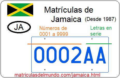 La matrícula de coche JA identifica a Jamaica, en América del Centro.