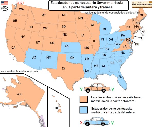 Puedes acceder al mapa en mayor calidad y con mayor zoom pulsando sobre él. El mapa de matrículas se abrirá en la misma pestaña o en una nueva pestaña en función del mapa y del país. Además, puedes acceder al país haciendo click en el link que se muestra junto a la imagen. En la parte derecha de la tabla, figura la fecha de introducción en matriculasdelmundo.com. En la primera columna se muestra el estado o territorio y la fecha en la que se representa el mapa mostrado. Puedes encontrar más información dentro de la propia imagen del mapa de matrículas.