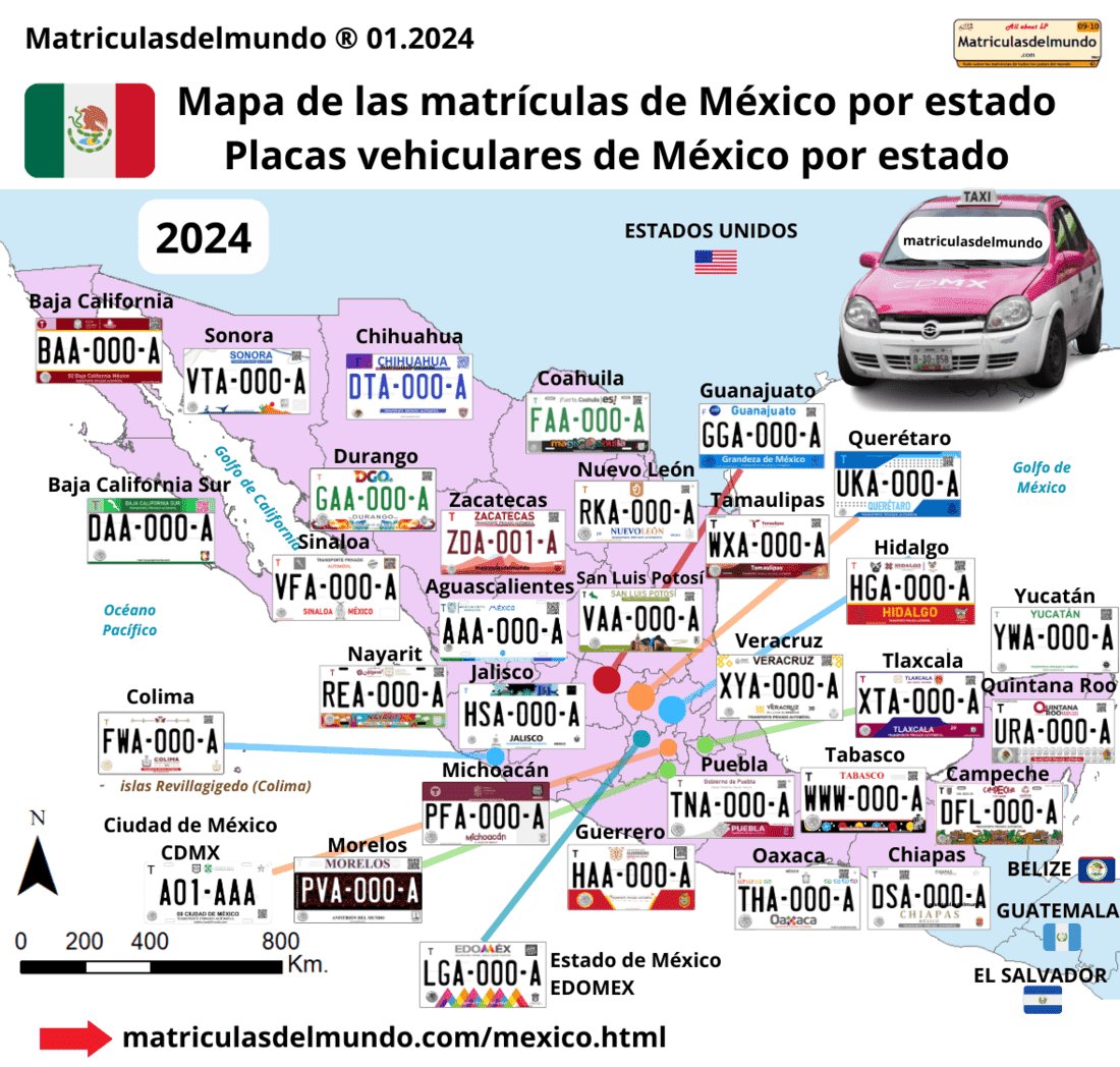 Las placas de matrículas automóviles de México actuales varían en función del estado en el que se matriculan. El tamaño es el estándar americano y por lo general en caracteres negros sobre fondo blanco. Cada estado mexicano utiliza un diseño de placa vehicular distinto, pero por lo general se muestra el nombre del estado mexicano del que se trata, el tipo de vehículo (por ejemplo TRANSPORTE PRIVADO AUTOMÓVIL), el escudo del estado y el escudo de México.