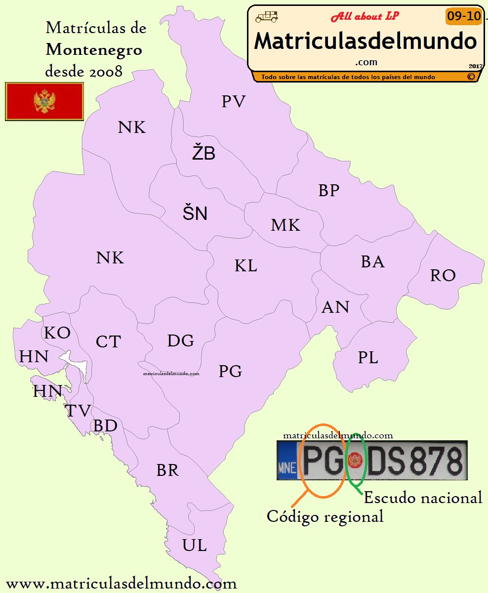 Las matrículas de coches de Montenegro desde 2009, utilizan placas con tamaño europeo, en caracteres negros sobre fondo blanco. En la parte izquierda de las matrículas de Montenegro se muestra una franja azul con el código de identificación internacional MNE. La configuración de las matrículas de Montenegro es de dos letras que identifican a la región, seguidas del escudo nacional, dos letras y tres números.