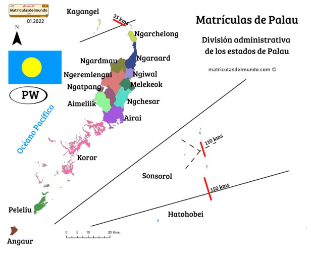Las matrículas de coches de Palau actuales varían en función de cada estado. El tamaño de las placas de matrícula en Palau (o Palaos) es el americano, normalmente validadas de manera anual. A continuación puedes consultar los detalles de cómo son las matrículas en cada una de las islas.