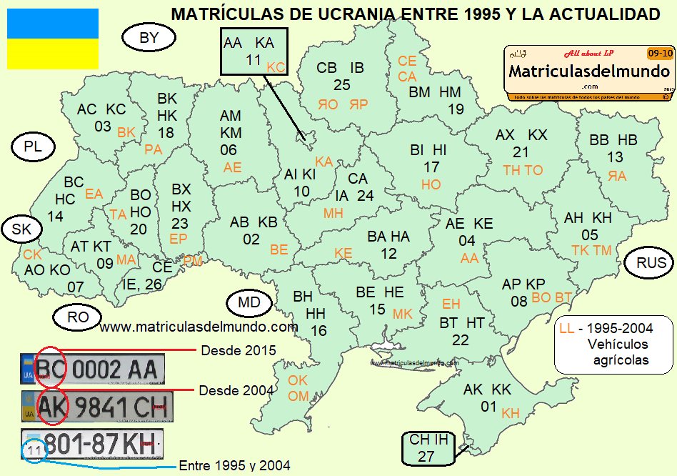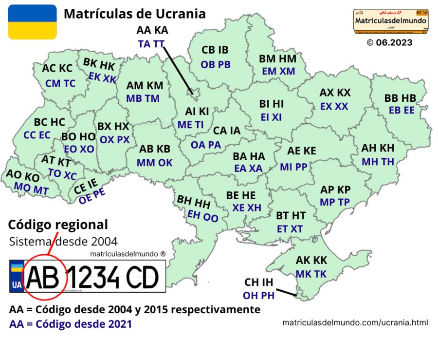 Las matrículas de coches de Ucrania desde 1995, utilizan placas de tamaño estándar europeo, en caracteres negros sobre fondo blanco. En la parte izquierda de la matrícula ucraniana se muestra una franja con los colores de la bandera ucraniana, el escudo arriba y el código UA debajo, o una franja azul con la bandera ucraniana en la parte superior y el código en la inferior. La configuración de las placas de matriculación vehiculares es de dos letras que identifican a la región, seguidas de cuatro números y dos letras.